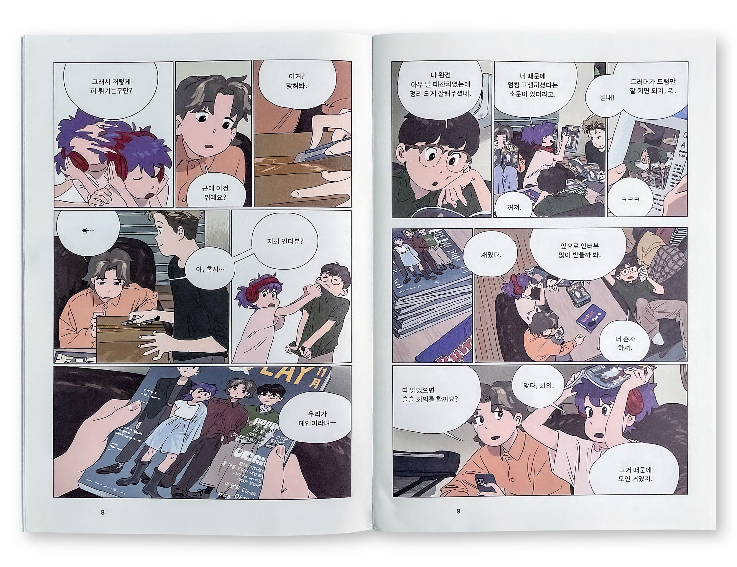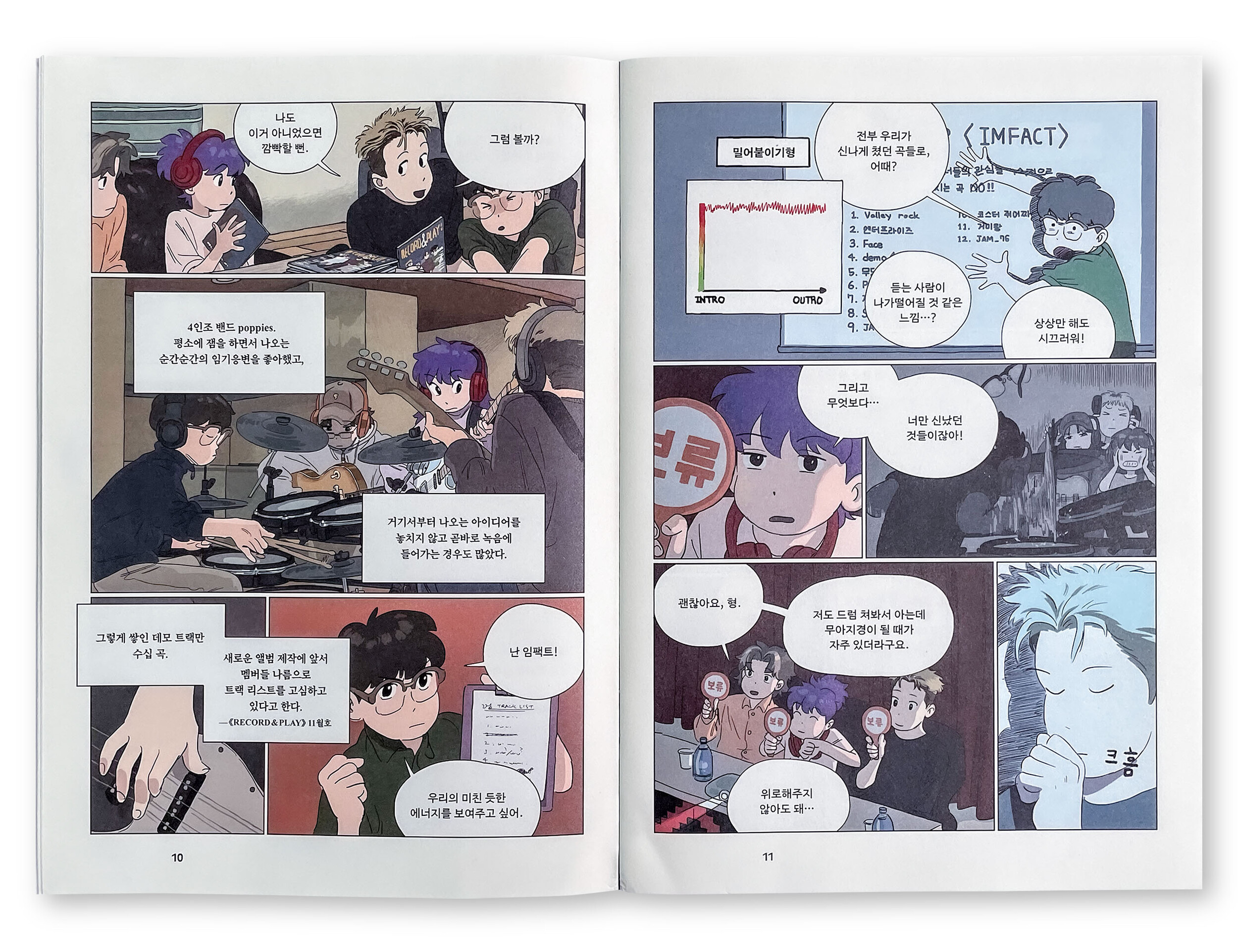 표정과 동세가 살아 있는 밴드의 귀엽고 즉흥적인 에피소드가 대사로, 그림으로 전해진다. 애니메이션을 전공하고, 꾸준히 만화를 온라인에 업로드해온 작가 윤재안의 작품이다. 잡지 첫 페이지를 막 장식하기 시작한 공룡 같은 신예밴드 poppies, 이들에게는 타이틀곡 정하기도 만만찮은 치열한 모험인데….