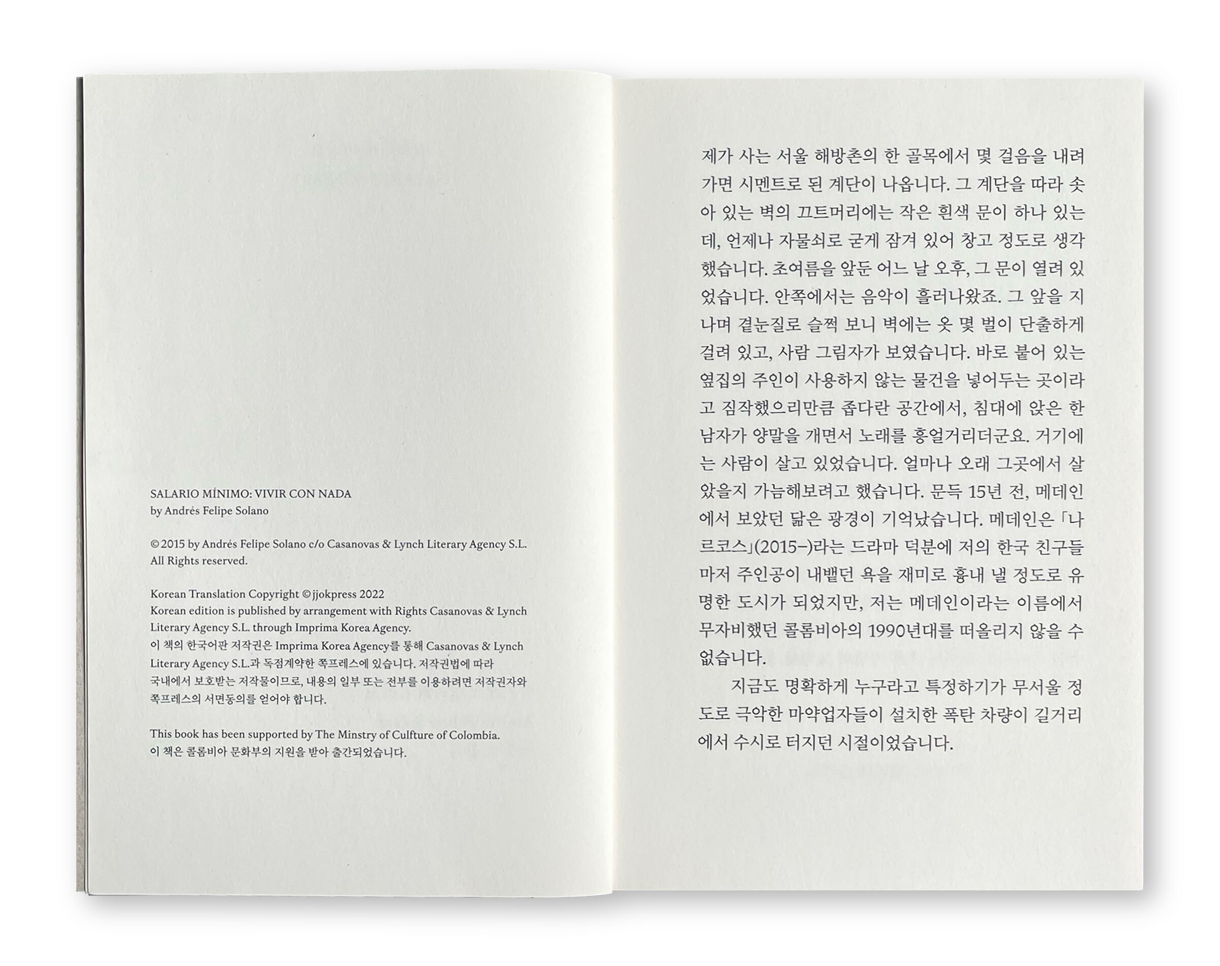 ‘최저임금’이라는 스페인어 ‘살라리오 미니모’에서는 시큼한 땀냄새와 남미 리듬이 진동한다. 『살라리오 미니모』는 최저임금이 가까스로 지탱해주는 삶보다는, 그것이 해할 수 없는 최저 아닌 삶의 한순간을 개인성의 필터로 포착한 주관적인 결과물이다. 정의(正義, 定義)를 담지 않았기에, 읽은 사람으로 하여금 오히려 그것들을 모색하게 하는 독특한 수기다.