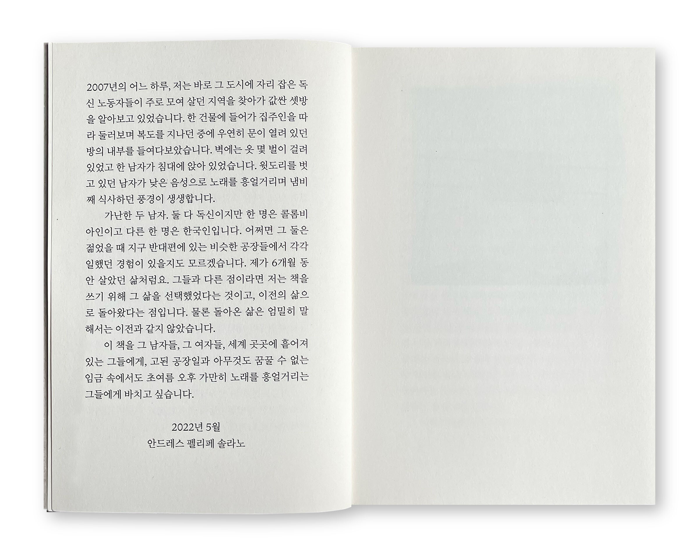 그는 반년간의 생활에서 ‘투토콜로레’(모든 색상이라는 이름을 지닌 섬유공장)에 스며들지 않고, 끝내 이방인으로 남는다. 애초에는 떠나야 할 곳에 강렬하게 짓눌렸거나, 돌아갈 곳을 철저하게 상기했기 때문이리라. 그러나 누군가가 떠나서 출발지로 돌아왔을 때 그는 더는 떠나기 전의 자신일 수 없음을 이 이야기는 암시한다. 단 반년간만 다른 사람으로 살고 싶었던 젊은 노동자는, 지금 이 순간에도 2007년과 전혀 다른 조건에서 전혀 다른 개체로서 살아가고 있다.(이에 관해 더 깊이 알고 싶다면 『한국에 삽니다』와 『열병의 나날들』을 참고하라. 모국과 지리적, 문화적으로 정반대에 있는 한국에서 그는 여전히 경계를 서성인다.)
