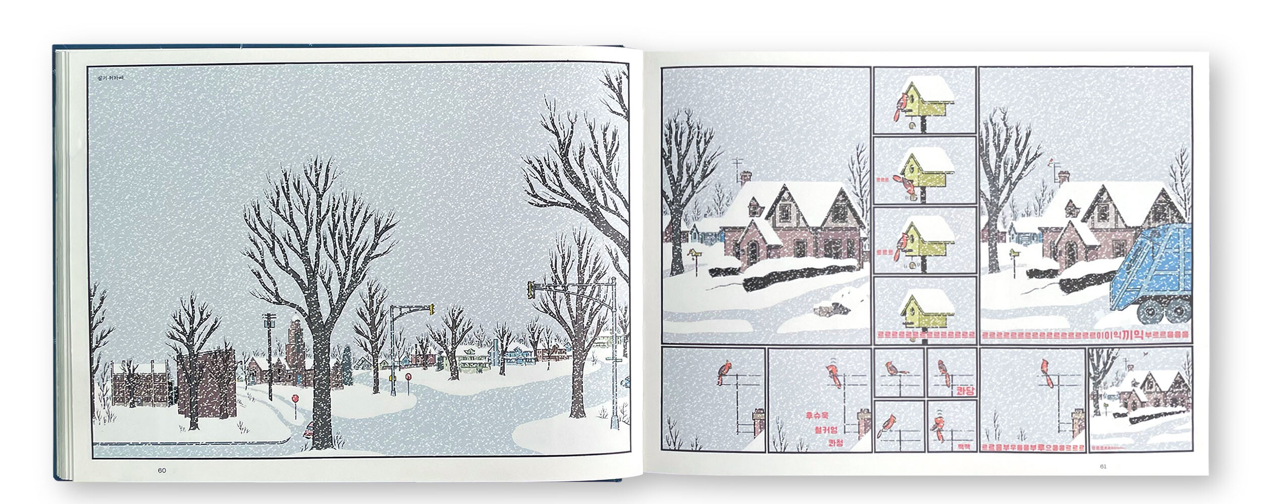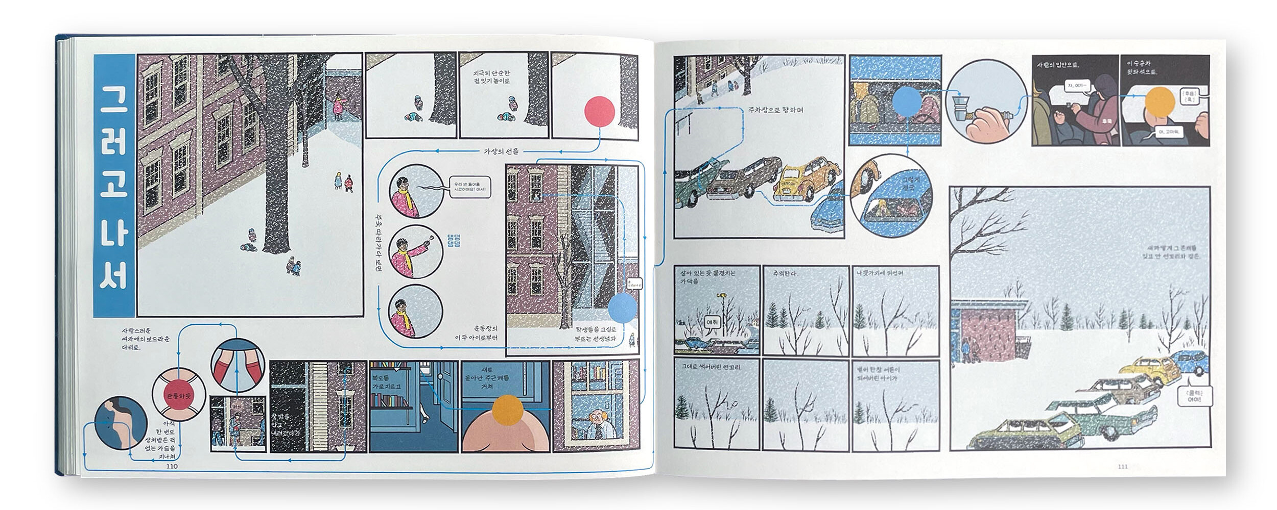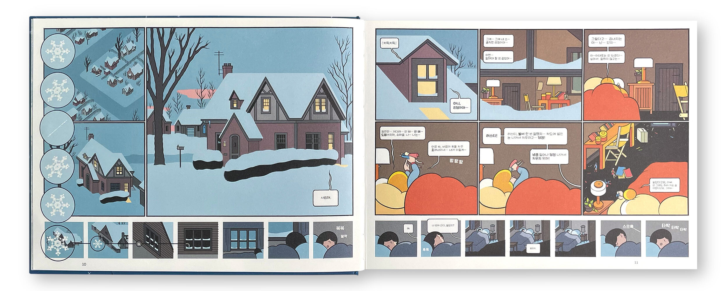 1970년대 미국 중서부 네브래스카의 눈 쌓인 저녁, 이 이야기는 시작됩니다. 하나의 눈 결정은 아름답고 완결적이며 날렵한 테두리를 둘렀지만, 이들이 이루는 눈보라는 비정형의 꼴로 속도를 내며 거기 속한 이들을 휩쓸고 묻습니다. 아주 작은 것부터 아주 큰 것까지, 다양한 크기의 칸을 통해 크리스 웨어는 여기 사는 사람들의 이야기를 한꺼번에 전달합니다. 무력한 인물들이나마, 지나쳐온 고유한 환경과 기억이 있고, 그 기억이 현재를 덮칠 때 이들의 미세하고 날카로운 감각이 되살아납니다. 이 책 속의 세부는 단순히 전체에 봉사하지 않으며, 그 자체로 의미를 발합니다.