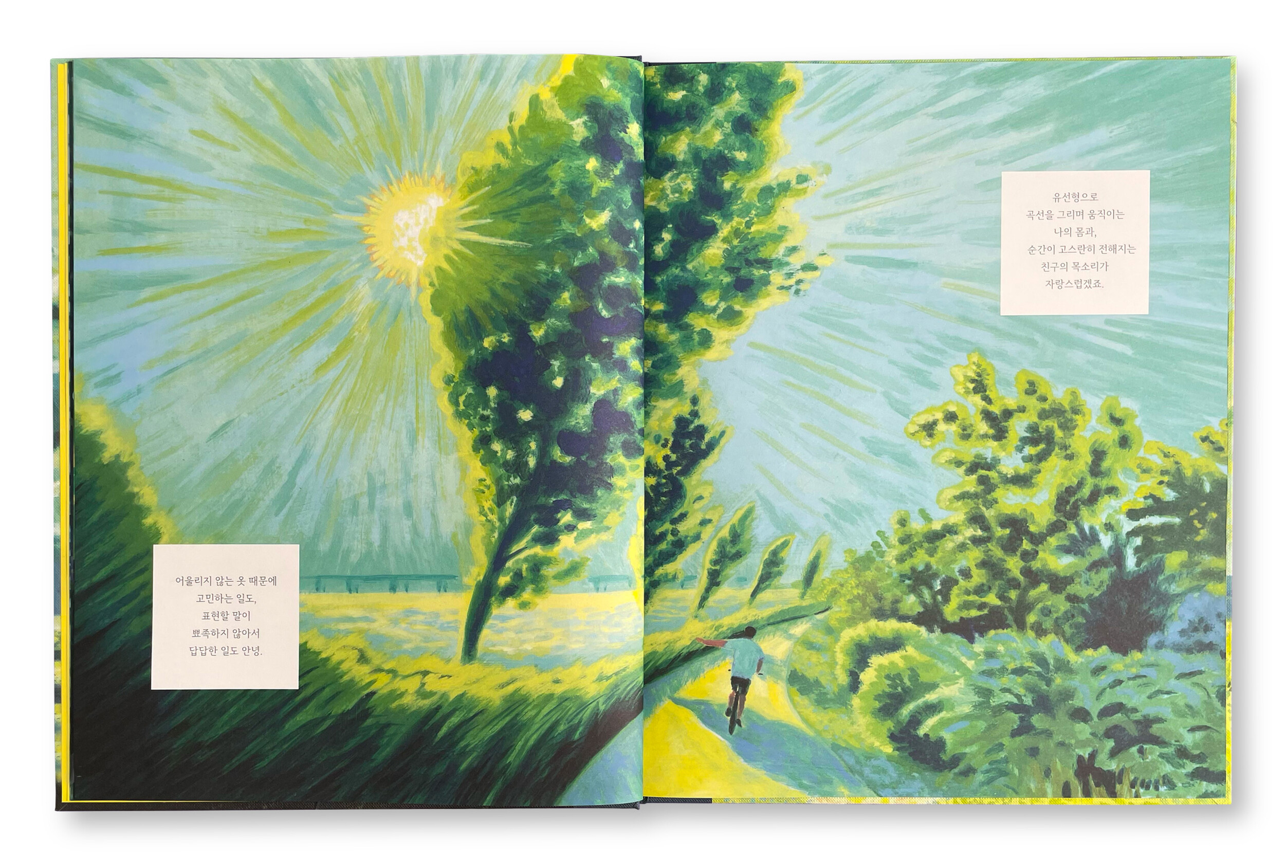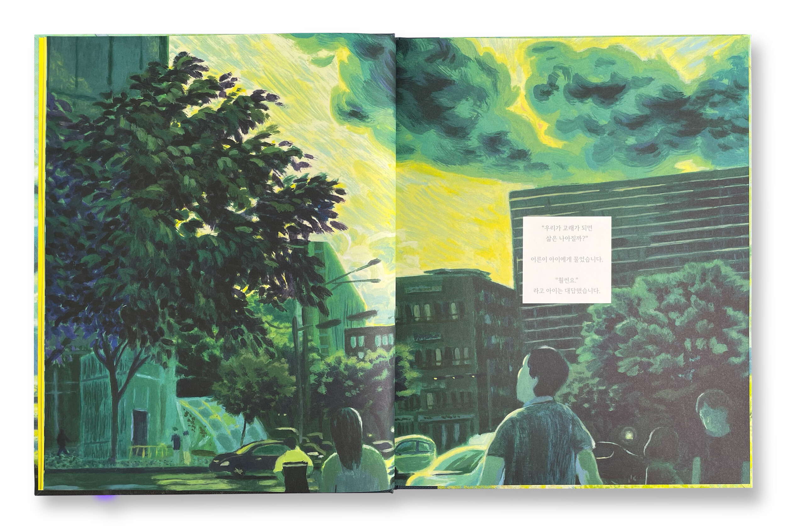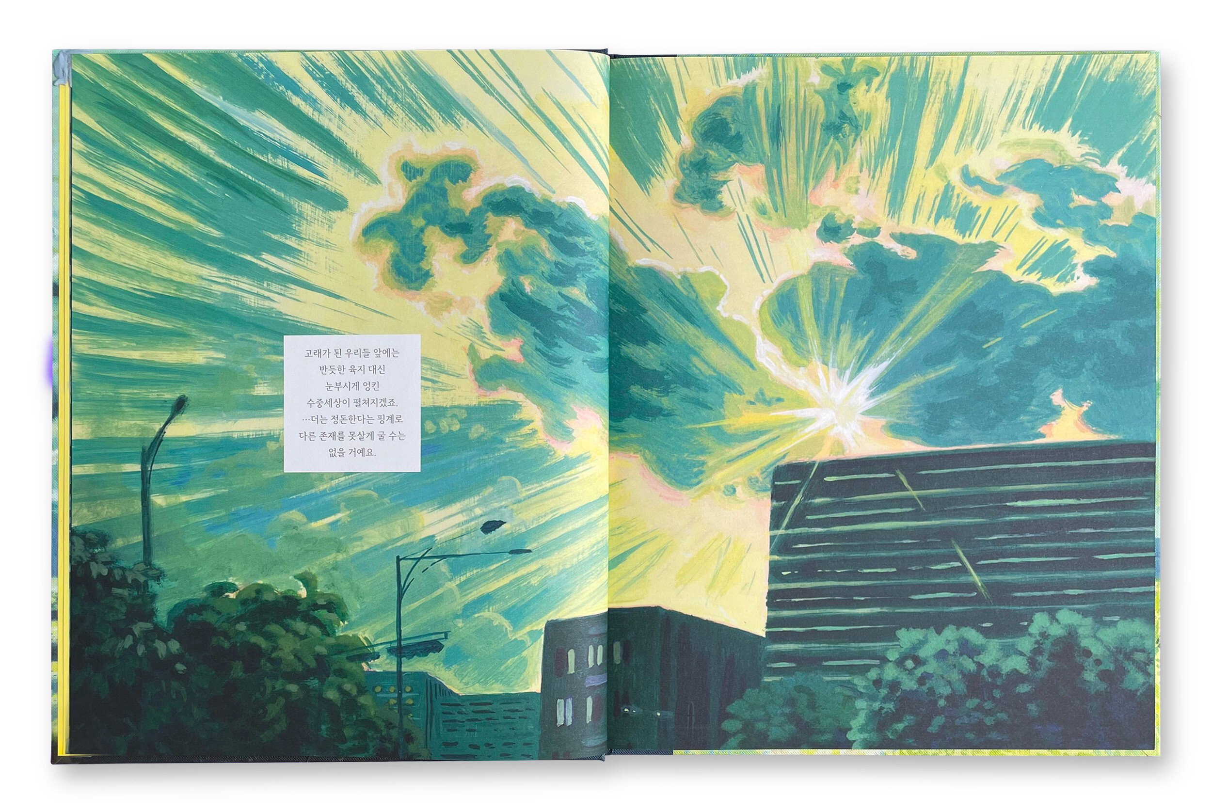 이 이야기는 하루의 시간을 담고 있습니다. 하루의 안에서 도시에서 자연으로, 작은 강줄기에서 바다로 나아가죠. 처음 『그건, 고래』의 텍스트를 읽었을 때, 저는 자연과 연결되어 있음을 아는 삶, 아주 작은 순간의 아름다움을 흘려보내지 않는 삶, 자신의 근원을 간직하는 삶을 떠올렸습니다. ‘바다’는 생명의 시작점이자 고래가 사는 곳이므로, 도시에서 바다로 나아가는 흐름을 꾸렸습니다. 이는 바다로 흘러드는 커다란 강이 있는 서울에 사는 덕에 가능했을 것입니다. 모든 그림은 제가 일상에서 ‘지금’을 느낀 순간에 해당합니다. 날씨와 빛의 영향을 많이 받는 사람인 저는 노을이나 윤슬 같은 일상적인 자연의 풍경에 자주 기댑니다. 우리의 삶에는 부정적인 감정이나 사건의 기억이 불쑥 올라와 자리를 차지하는 날도, 아무 일도 일어나지 않아 그저 잔잔할 뿐인 날도 있습니다. 그러나 어떤 날이든 간에, 그 하루 속에 얼마나 많은 아름다움의 순간들이 존재했던가를 이 책을 그리면서 실감했습니다. 현재의 순간을 만끽하는 경험들로 배를 만들어 시간이라는 물살 위를 유유히 유영하는 것만 같았어요. 낱장의 페이지가 엮여 단단한 책이 되는 것과 마찬가지로, 사소하지만 오래 기억되는 순간들이 쌓여 한 삶을 단단하게 일군다는 것, 우리는 언제나 되태어나고 있다는 것이 읽는 분에게 전해진다면 기쁘겠습니다. - 다안