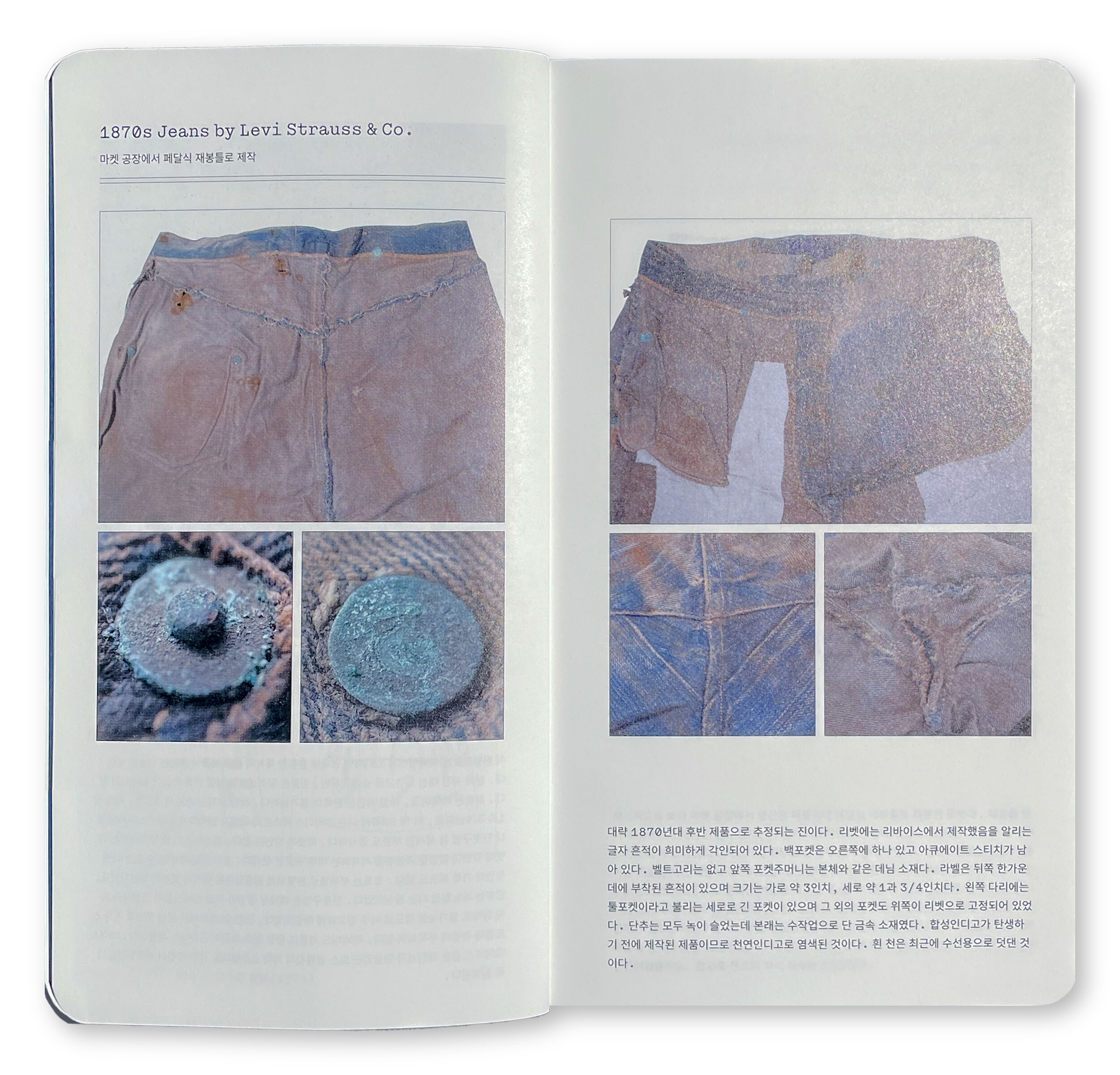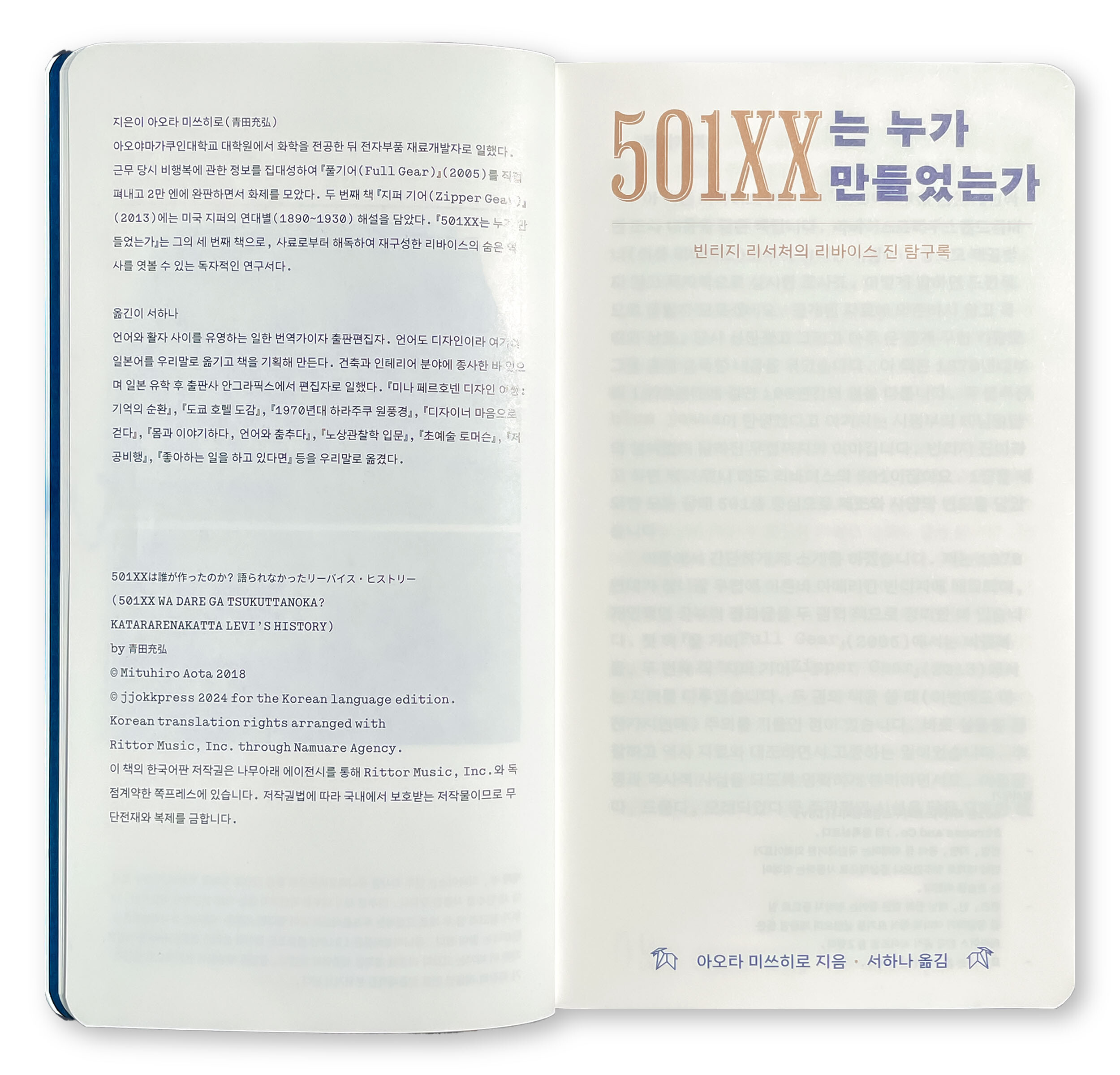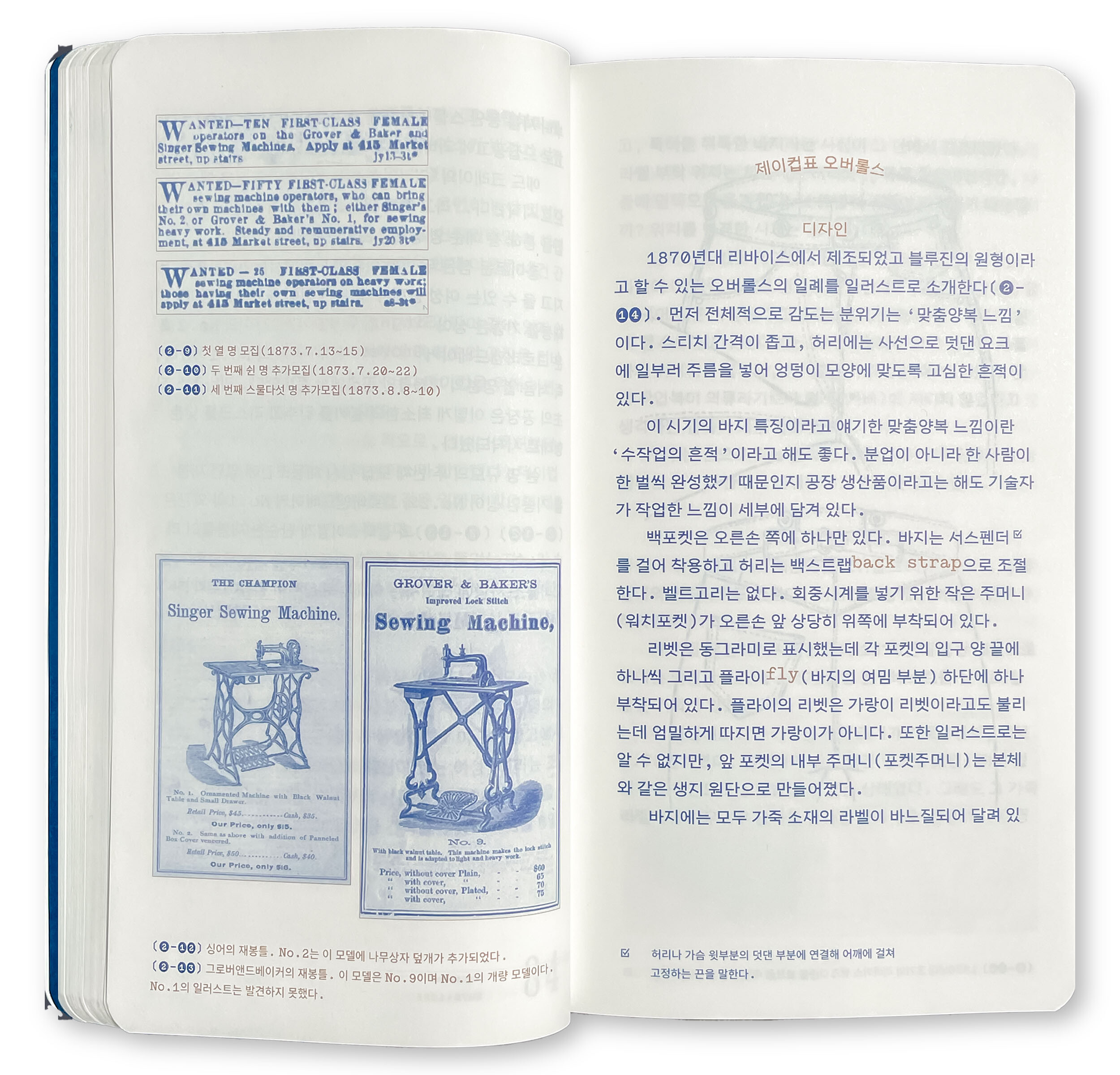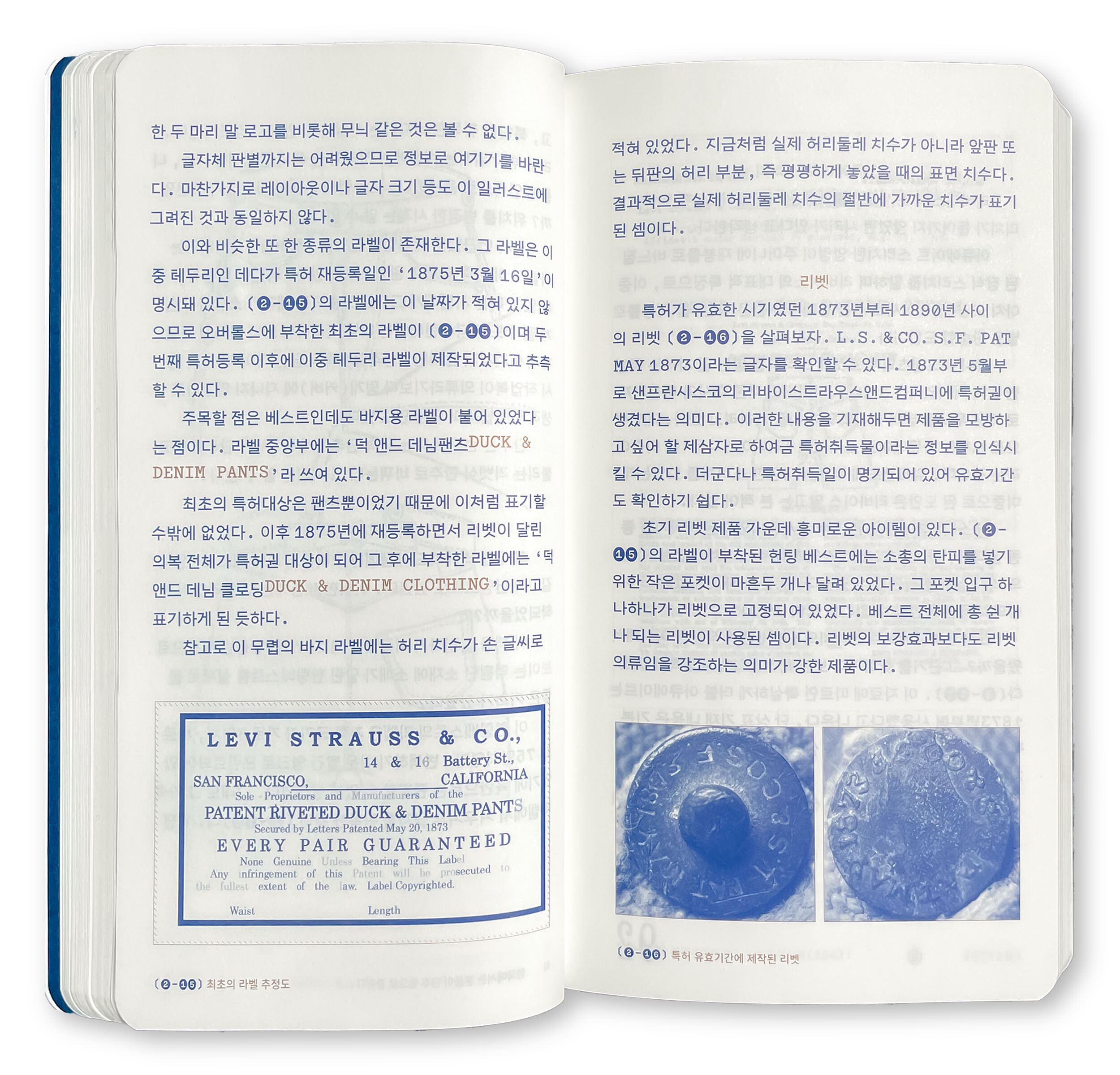 501의 지독한 팬이자 성실한 빈티지 리서처인 아오타는 숨어 있던 여러 사료(리바이스의 구인광고까지…)를 수집하고 분류하여 한 권의 책으로 정리했습니다. 우리가 리바이스에 대해 익히 알고 있던 사실보다, 전혀 몰랐던 사실, 어쩌면 영원히 몰라도 될 사실, 몰라도 입는 데는 전혀 지장이 없을 사실, 그렇지만 그렇기에 알고 나서는 한 번 더 시선을 머물게 만드는 작디작은 진의 요소들, 원단의 작은 굴곡, 스티치의 미묘한 색상 등을 배우게 됩니다. 어쩌면 당신은 막연히 좋아하던 것에서 전혀 새로운 면모들을 발견하고, 그제서야 진짜로 그것을 알고, 그러면서도 여전히 혹은 한층 좋아하는 마음을 다지게 될 것입니다. 이 애정은 우리가 가진 고작 한 장의 의류에서 150여 년의 역사를 감지하는 동안 스민 전리품이겠죠.