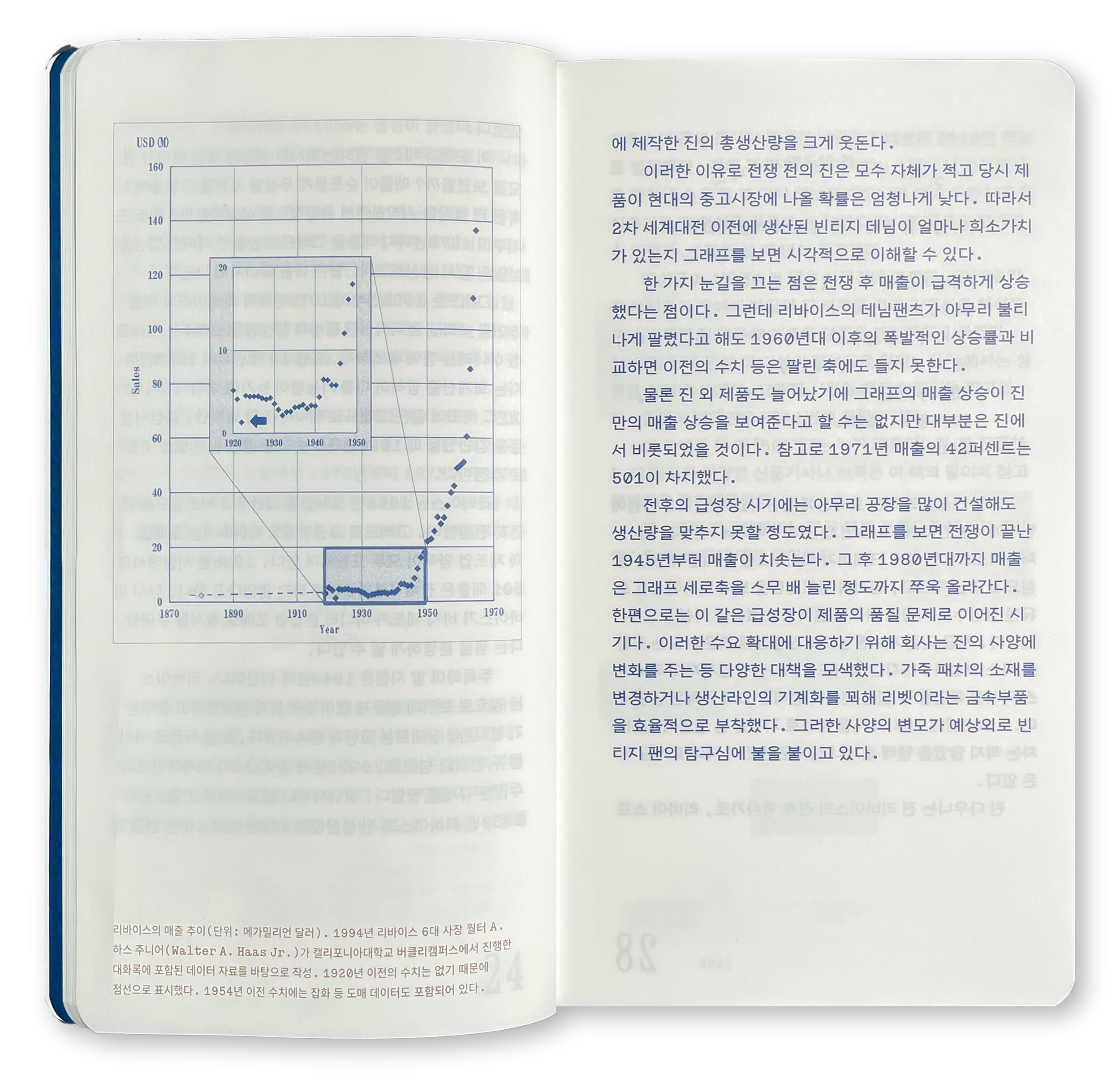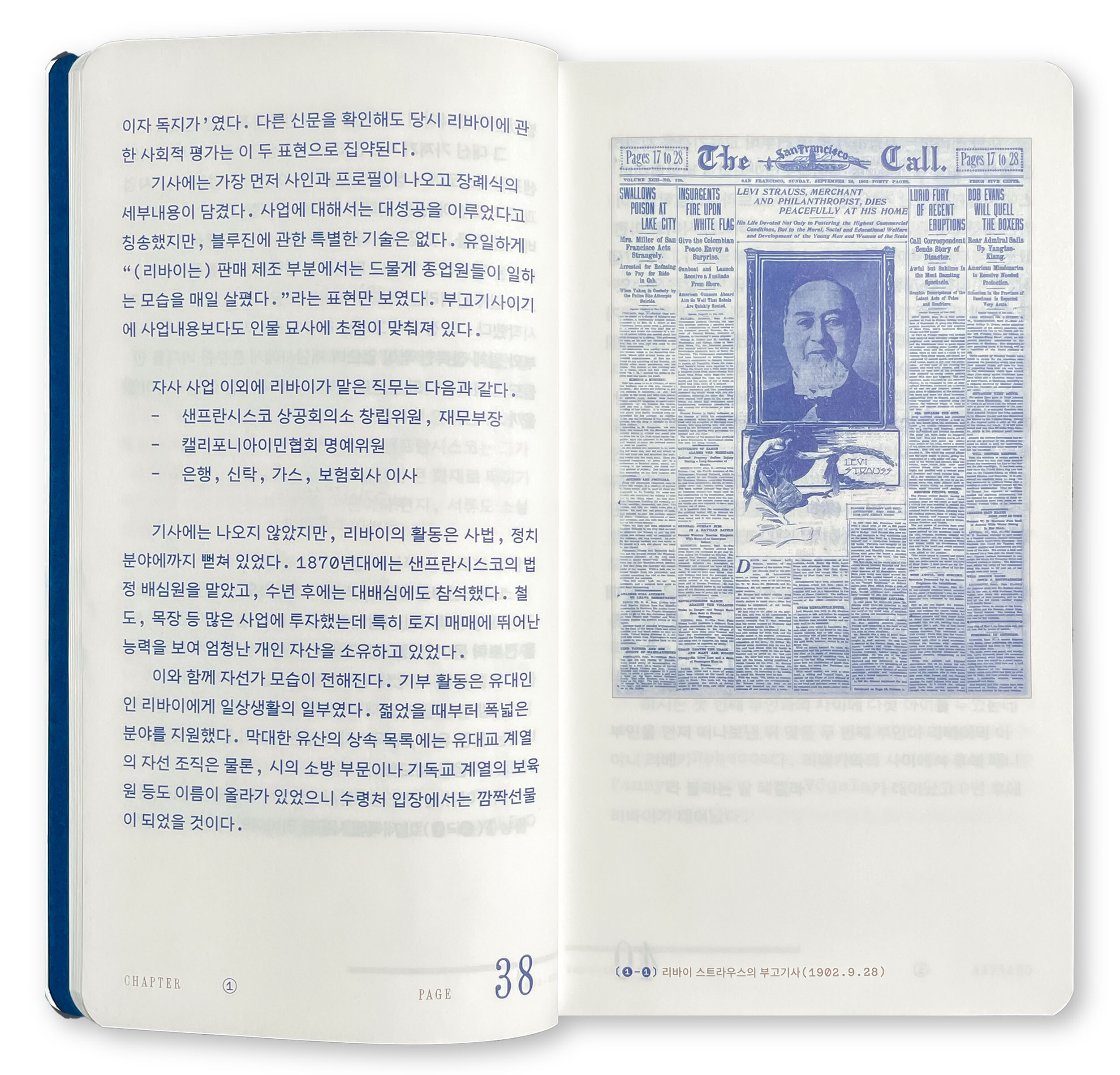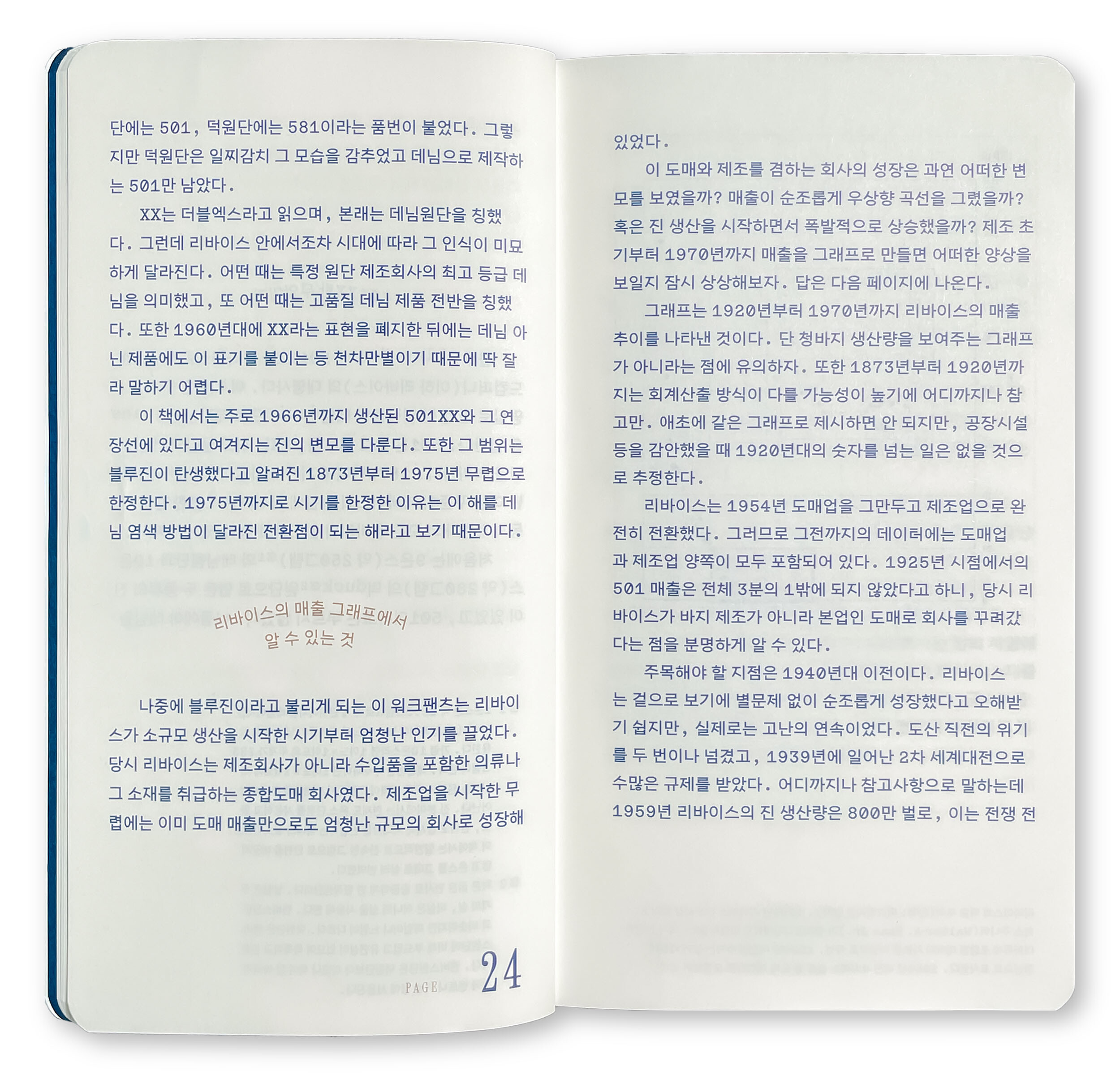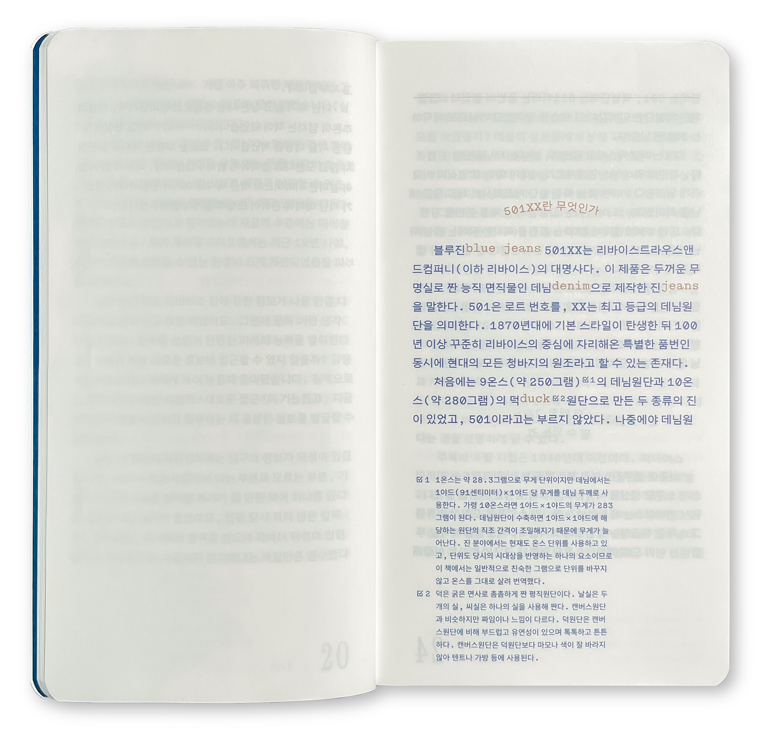 501의 지독한 팬이자 성실한 빈티지 리서처인 아오타는 숨어 있던 여러 사료(리바이스의 구인광고까지…)를 수집하고 분류하여 한 권의 책으로 정리했습니다. 우리가 리바이스에 대해 익히 알고 있던 사실보다, 전혀 몰랐던 사실, 어쩌면 영원히 몰라도 될 사실, 몰라도 입는 데는 전혀 지장이 없을 사실, 그렇지만 그렇기에 알고 나서는 한 번 더 시선을 머물게 만드는 작디작은 진의 요소들, 원단의 작은 굴곡, 스티치의 미묘한 색상 등을 배우게 됩니다. 어쩌면 당신은 막연히 좋아하던 것에서 전혀 새로운 면모들을 발견하고, 그제서야 진짜로 그것을 알고, 그러면서도 여전히 혹은 한층 좋아하는 마음을 다지게 될 것입니다. 이 애정은 우리가 가진 고작 한 장의 의류에서 150여 년의 역사를 감지하는 동안 스민 전리품이겠죠.