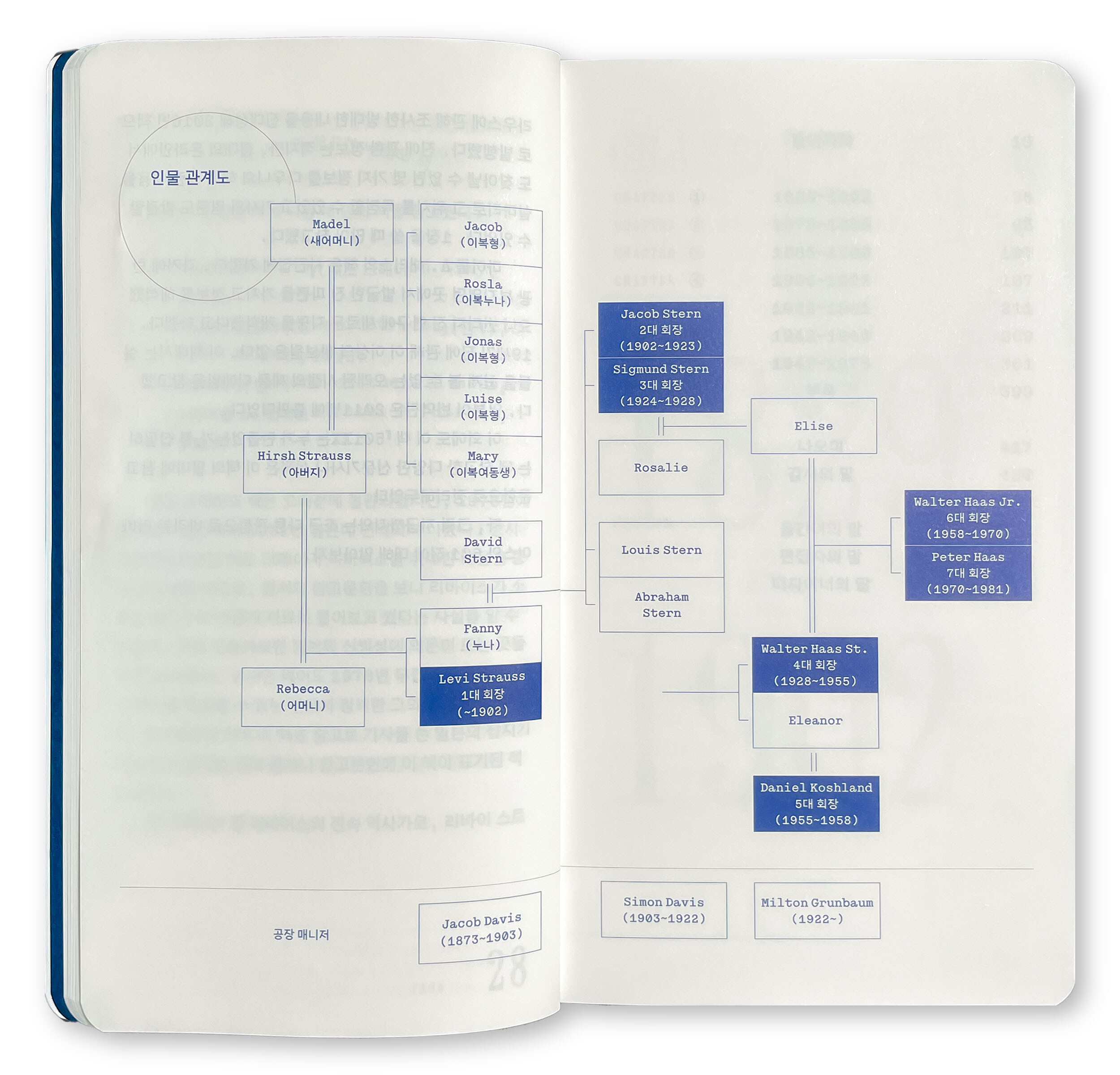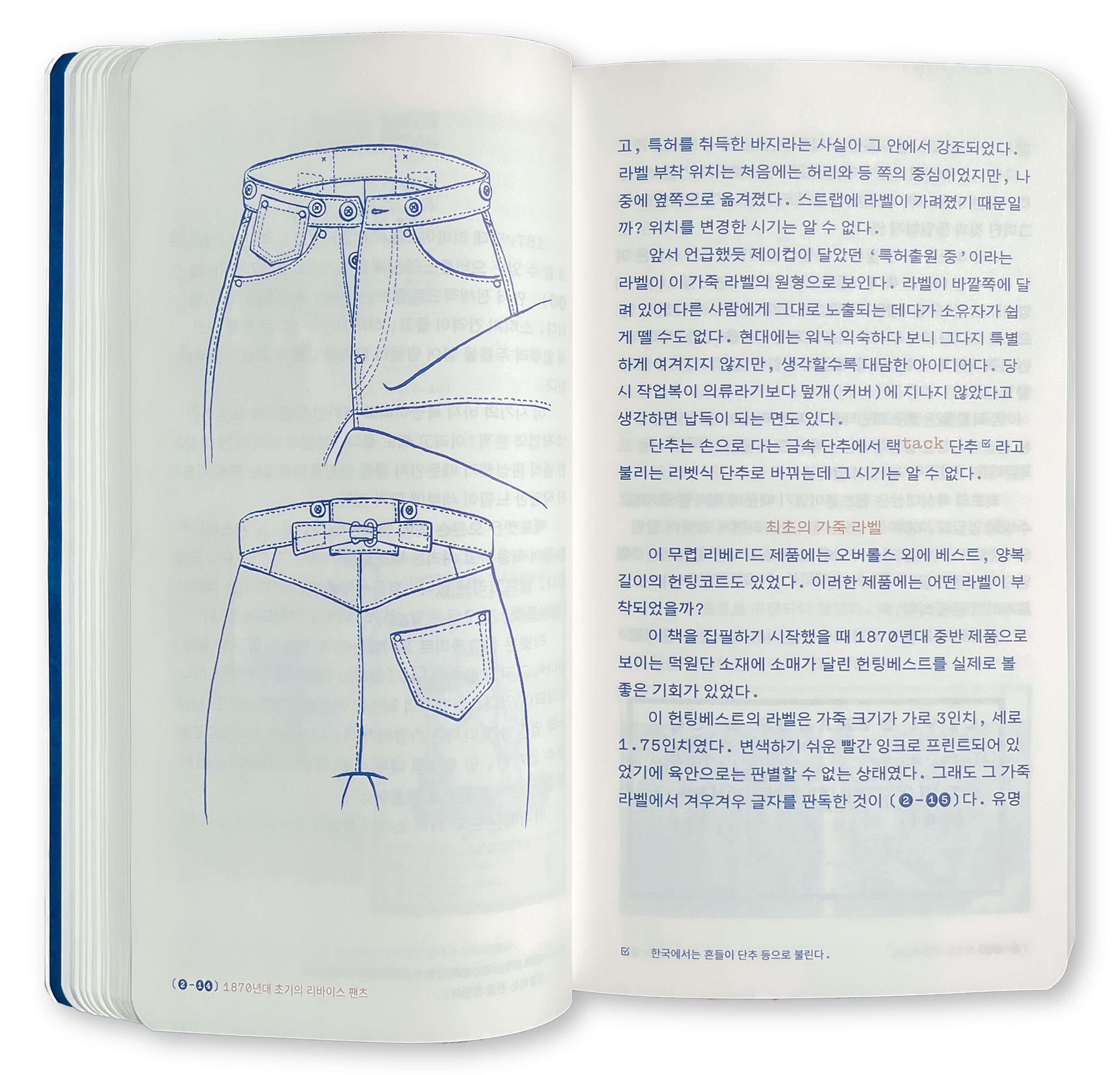 도중에 편집자의 제안으로 레드탭 빨강을 구리 리벳 색으로 바꿨는데(‘편집자의 말’ 참고), 리벳이 리바이스의 명성을 일으킨 핵심 요소임을 감안하면 타당한 의견이었기에 기꺼이 동의했다. 이 책이 아니면 보기 힘든 자료가 많이 실려 도판을 가급적 키웠다. 그 과정에서 배치 순서가 원서와 달라졌고 그에 맞게 도판 번호를 고쳐야 했다. 페이지 수도 원서(원서는 국판, 즉 A5 판형에 총 272쪽) 대비 꽤 많이 늘었다.