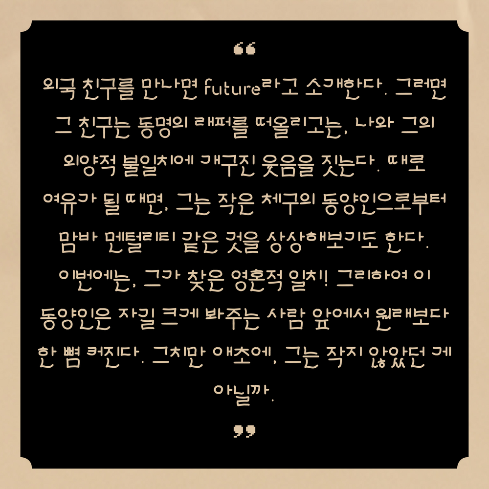 ❝외국 친구를 만나면 future라고 소개한다. 그러면 그 친구는 동명의 래퍼를 떠올리고는, 나와 그의 외양적 불일치에 개구진 웃음을 짓는다. 때로 여유가 될 때면, 그는 작은 체구의 동양인으로부터 맘바 멘털리티 같은 것을 상상해보기도 한다. 이번에는, 그가 찾은 영혼적 일치! 그리하여 이 동양인은 자길 크게 봐주는 사람 앞에서 원래보다 한 뼘 커진다. 그치만 애초에, 그는 작지 않았던 게 아닐까.❞