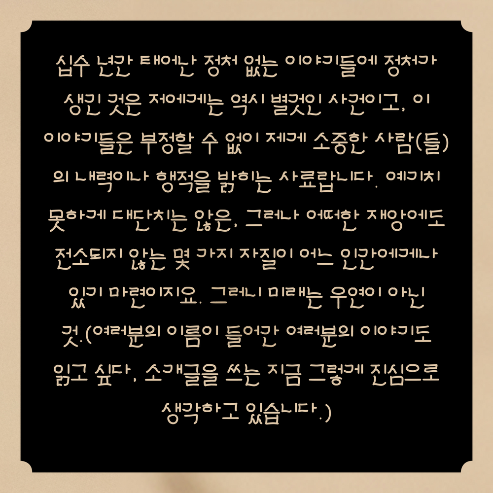 눈치채셨겠지만, 저자의 이름이 제목에 박혀 있는 이야기집입니다. 전문 에세이스트가 아니기 때문에(못 되었다고 보실 수도 있겠지만 꼭 되어야 할까 하는 심리도 있습니다), 또 지어 쓴 여러 가지 이야기도 한데 들어 있기 때문에, 물론 제 경험에 기초해 쓴 것도 지극히 주관적인 필터를 거친 것이기 때문에 여하간에 산문집보다는 이야기집이라고 부르고 싶습니다. 초판 수량의 절반은 친구들에게 선물하고 남은 절반은 판매하려고 합니다. 대단한 고료를 받고 쓴 것도, 대단한 사명을 띠고 쓴 것도 아니지만, 십수 년간 태어난 정처 없는 이야기들에 정처가 생긴 것은 저에게는 역시 별것인 사건이고, 이 이야기들은 부정할 수 없이 제게 소중한 사람(들)의 내력이나 행적을 밝히는 사료랍니다. 예기치 못하게 대단치는 않은, 그러나 어떠한 재앙에도 전소되지 않는 몇 가지 자질이 어느 인간에게나 있기 마련이지요. 그러니 미래는 우연이 아닌 것.(여러분의 이름이 들어간 여러분의 이야기도 읽고 싶다, 소개글을 쓰는 지금 그렇게 진심으로 생각하고 있습니다.)