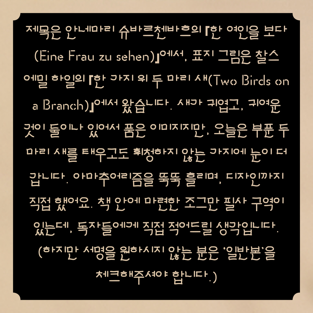 제목은 안네마리 슈바르첸바흐의 「한 여인을 보다(Eine Frau zu sehen)」에서, 표지 그림은 찰스 에밀 하일의 「한 가지 위 두 마리 새(Two Birds on a Branch)」에서 왔습니다. 새가 귀엽고, 귀여운 것이 둘이나 있어서 품은 이미지지만, 오늘은 부푼 두 마리 새를 태우고도 휘청하지 않는 가지에 눈이 더 갑니다. 아마추어리즘을 뚝뚝 흘리며, 디자인까지 직접 했어요. 책 안에 마련한 조그만 필사 구역이 있는데, 독자들에게 직접 적어드릴 생각입니다.(하지만 서명을 원하시지 않는 분은 '일반본'을 체크해주셔야 합니다.)