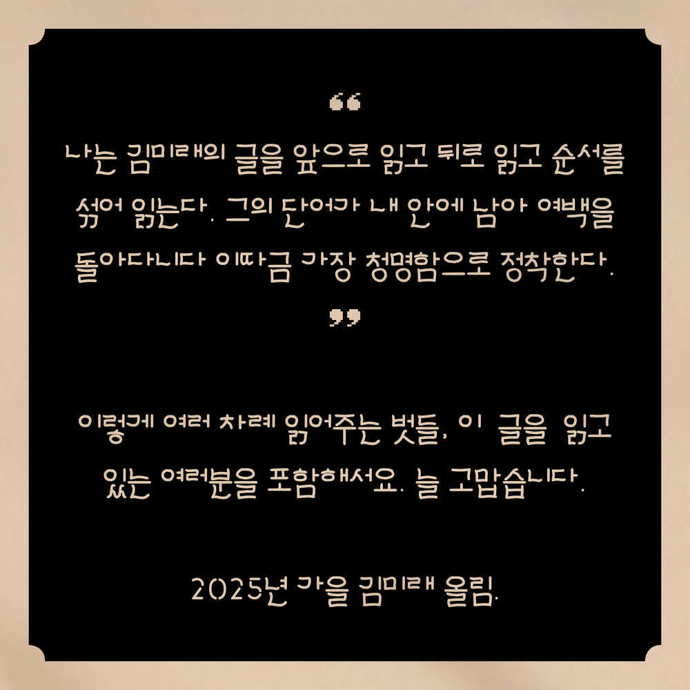 ❝나는 김미래의 글을 앞으로 읽고 뒤로 읽고 순서를 섞어 읽는다. 그의 단어가 내 안에 남아 여백을 돌아다니다 이따금 가장 청명함으로 정착한다.❞ | 이재영 (그래픽디자이너)