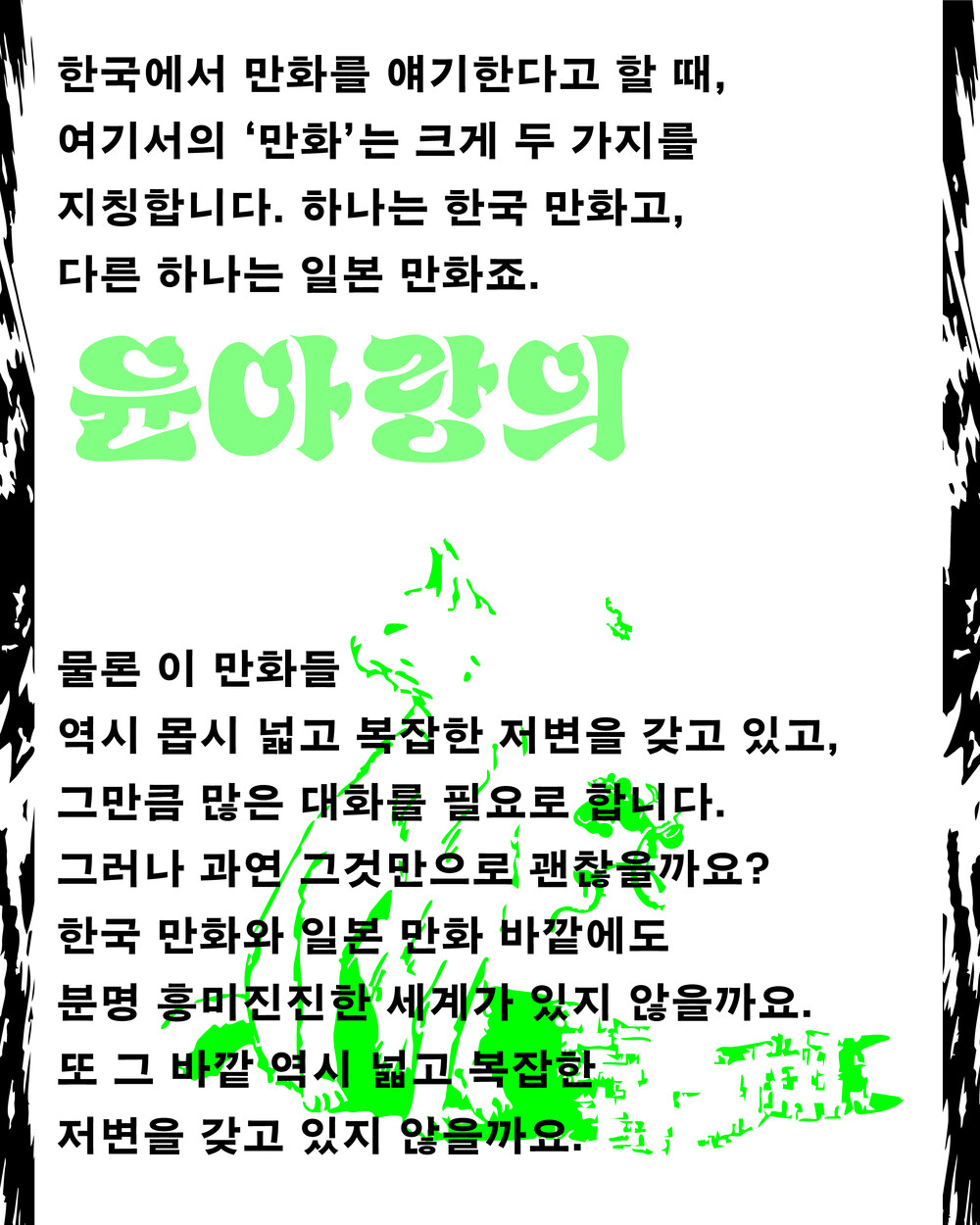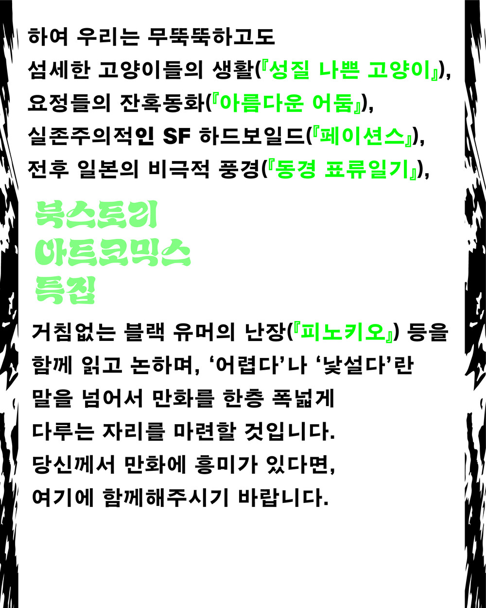 11번째 기획은 이런 마음과 함께 준비되었습니다.하여 우리는 무뚝뚝하고도 섬세한 고양이들의 생활(『성질 나쁜 고양이』), 요정들의 잔혹동화(『아름다운어둠』), 실존주의적인 SF 하드보일드(『페이션스』), 전후 일본의 비극적 풍경(『동경 표류일기』), 거침없는블랙 유머의 난장(『피노키오』) 등을 함께 읽고 논하며, '어렵다'나 '낯설다'란 말을 넘어서 만화를 한층 폭넓게대할 수 있는 자리를 마련할 것입니다. 당신께서 만화에 흥미가 있다면, 여기에 함께해 주시기 바랍니다.