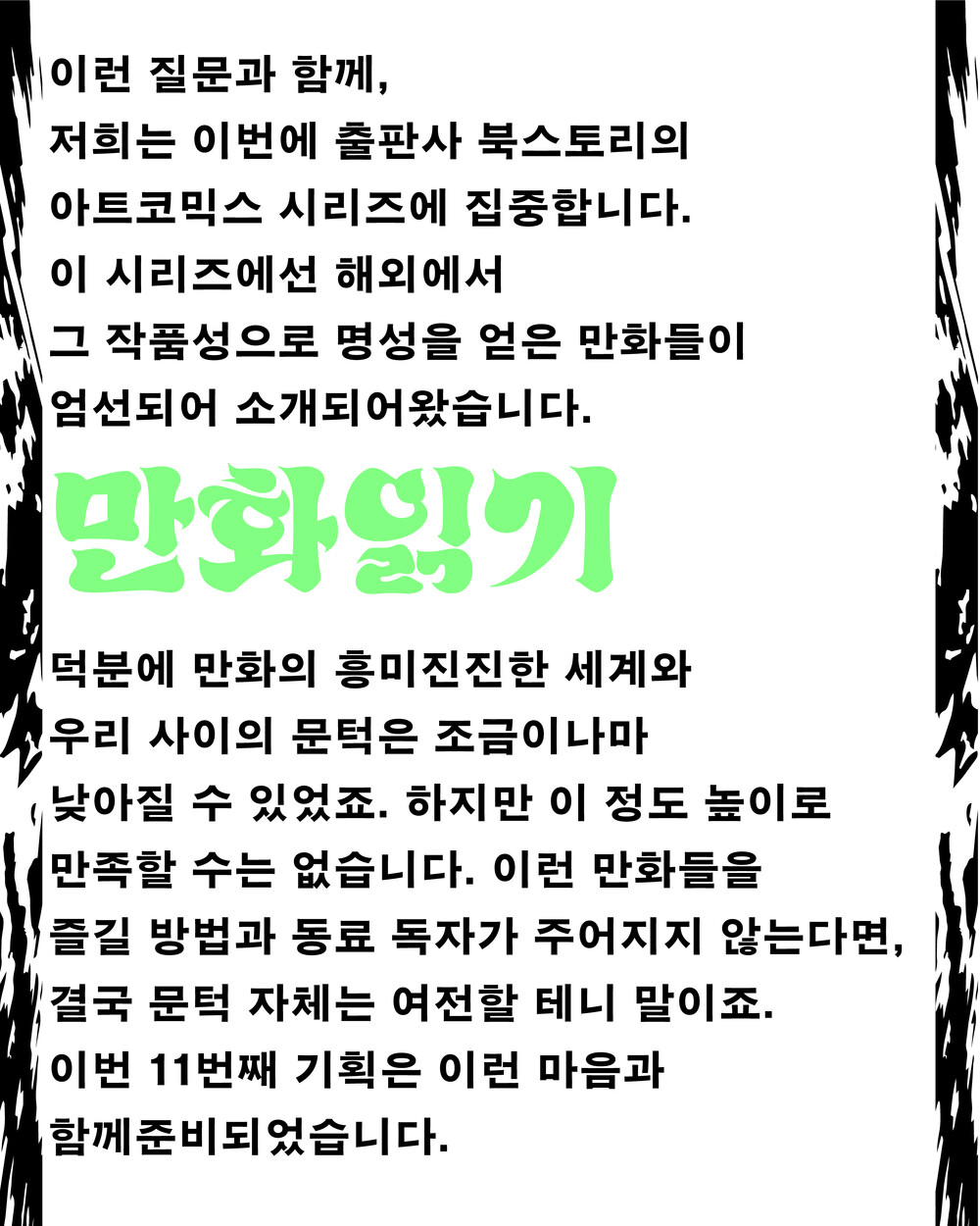 한국에서 만화를 얘기한다고 할 때, 여기서의 ‘만화’는 크게 두 가지를 지칭합니다. 하나는 한국 만화고, 다른하나는 일본 만화죠. 물론 이 만화들 역시 몹시 넓고 복잡한 저변을 갖고 있고, 그만큼 많은 대화를 필요로 합니다.그러나 과연 그것 만으로 괜찮은 걸까요? 한국 만화와 일본 만화 바깥에도 분명 흥미진진한 세계가 있지 않을까요.또 그 바깥 역시 넓고 복잡한 저변을 갖고 있지 않을까요.이런 질문과 함께, 저희는 이번에 출판사 북스토리의 아트코믹스 시리즈에 집중해보려 합니다. 이 시리즈에선해외에서 그 작품성으로 명성을 얻은 만화들이 엄선되어 소개되어왔습니다. 덕분에 만화의 흥미진진한 세계와우리 사이의 문턱은 조금이나마 낮아질 수 있었죠. 하지만 이 정도 낮아진 것만으로 만족할 수는 없습니다. 이런만화들을 즐길 수 있는 방법과 동료 독자가 주어지지 않는다면, 결국 문턱의 높이는 여전할 테니 말이죠. 이번