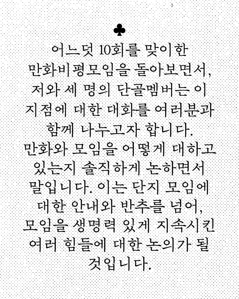 하지만 감사만 전하는 것으로는 좀 부족한 것 같습니다. 모임을 기획하고 진행하는 와중에 제 안에서 엄청나게 커진 생각이 하나 있습니다. 그것은 '단골 멤버들이 어떤 만화를 어떻게 좋아하는지 모두에게 알려주고 싶다!'라는 생각이었지요. 만화에 대한 이들의 열의와 견해를 널리 퍼트리는 건, 실은 만화 자체를 널리 영업하는 것만큼이나 필요한 일이 아닐까요? 이런 감사함을 넘어선 현시욕을, 저는 한 번 밀고 나가고자 했답니다.