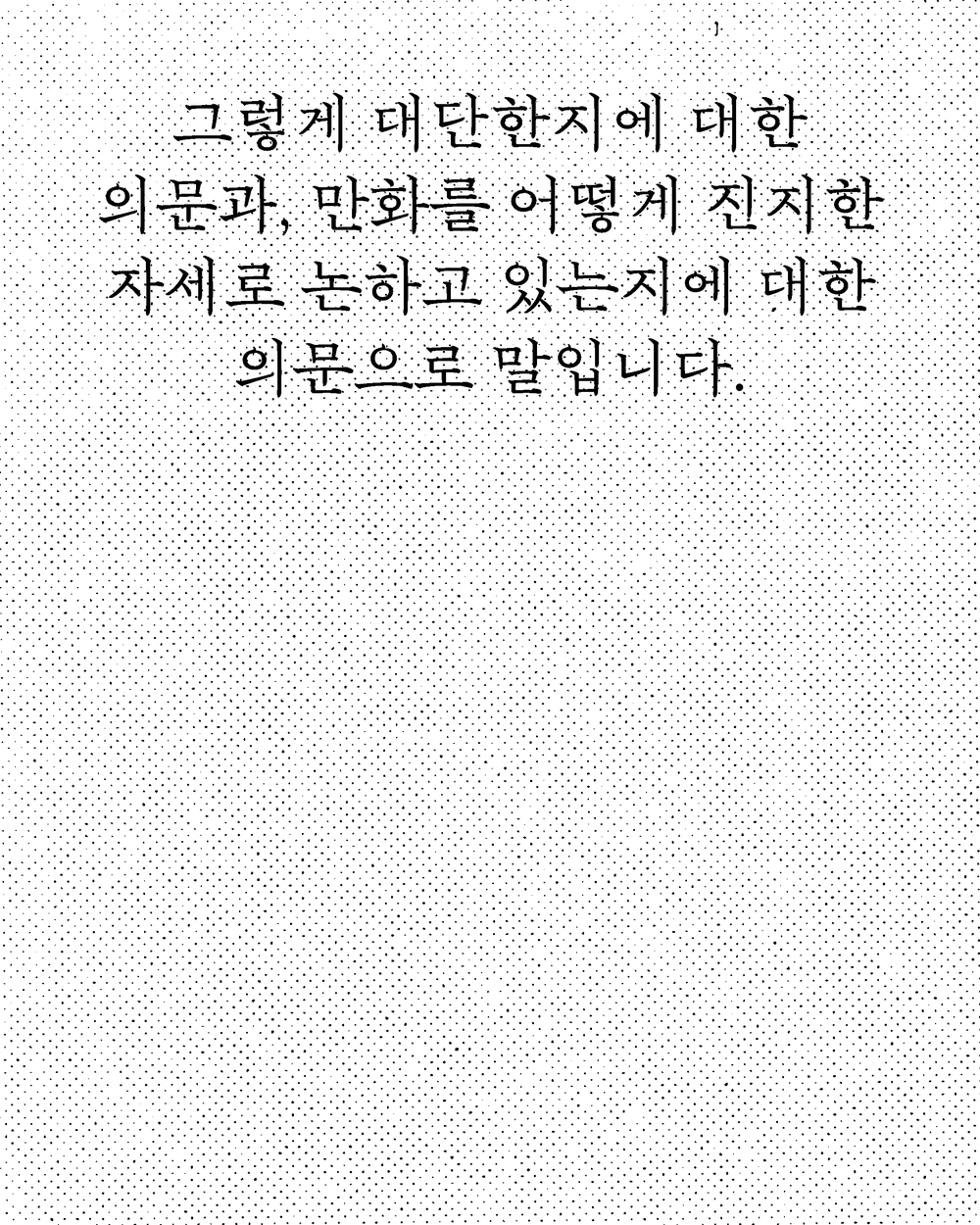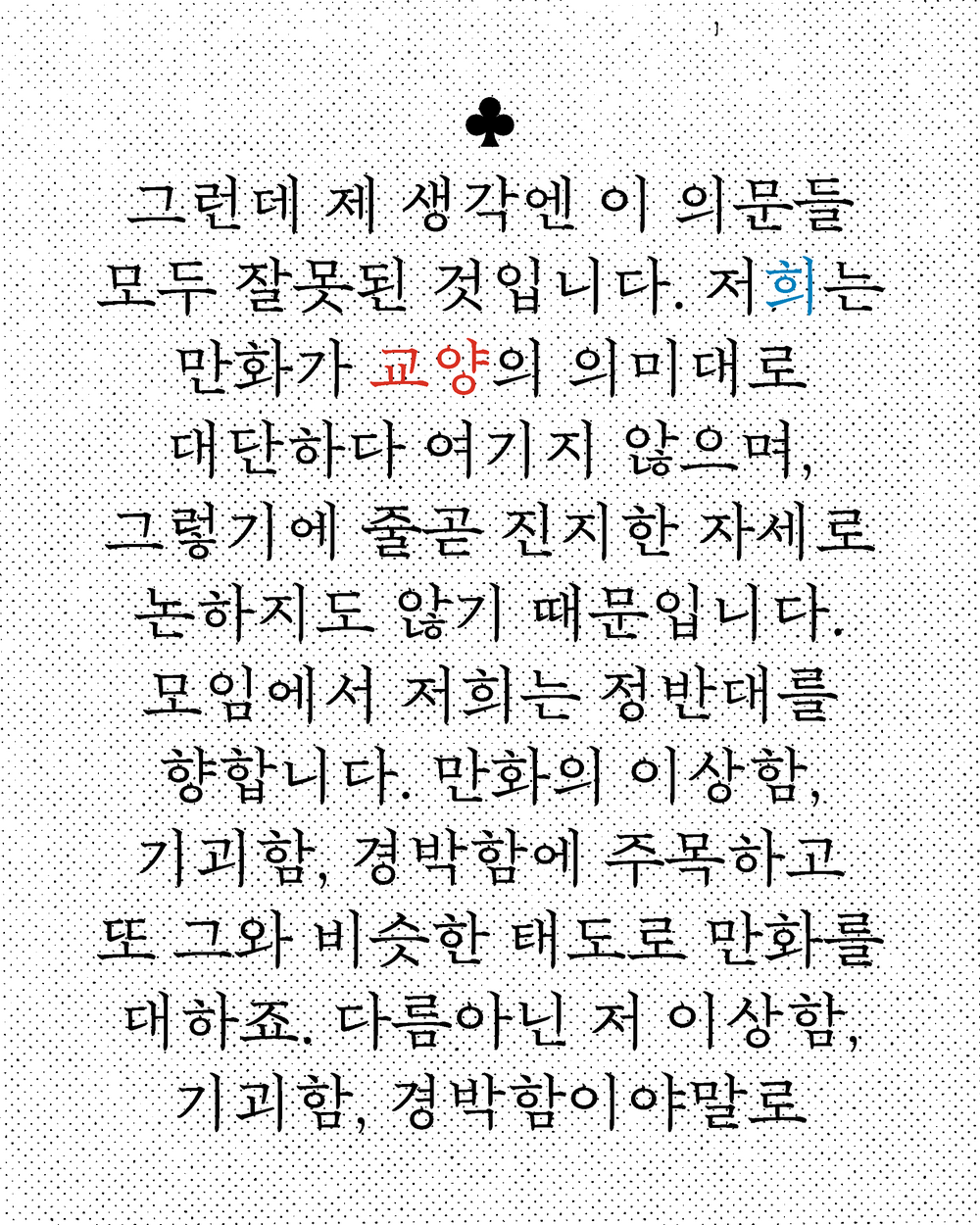 그런데 제 생각엔 이 의문들 모두 잘못된 것입니다. 저(희)는 만화가 ‘교양’의 의미대로 대단하다 여기지 않으며, 그렇기에 줄곧 진지한 자세로 논하지도 않기 때문입니다. 모임에서 저희는 정반대를 향합니다. 만화의 이상함, 기괴함, 경박함에 주목하고 또 그와 비슷한 태도로 만화를 대하죠. 다름아닌 저 이상함, 기괴함, 경박함이야말로 만화를 이 세상에 필요한 것으로 만들어주니 말입니다.