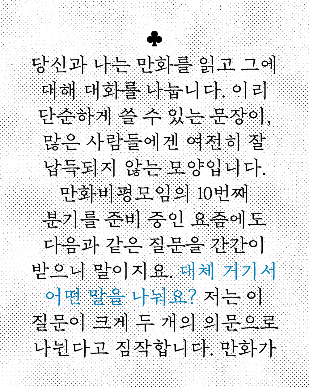당신과 나는 만화를 읽고 그에 대해 대화를 나눕니다. 이리 단순하게 쓸 수 있는 문장이, 많은 사람들에겐 여전히 잘 납득되지 않는 모양입니다. 만화비평모임의 10번째 분기를 준비 중인 요즘에도 다음과 같은 질문을 간간이 받으니 말이지요. “대체 거기서 어떤 말을 나눠요?” 저는 이 질문이 크게 두 개의 의문으로 나뉜다고 짐작합니다. 만화가 그렇게 대단한 지에 대한 의문과, 만화를 어떻게 진지한 자세로 논하고 있는지에 대한 의문으로 말입니다.