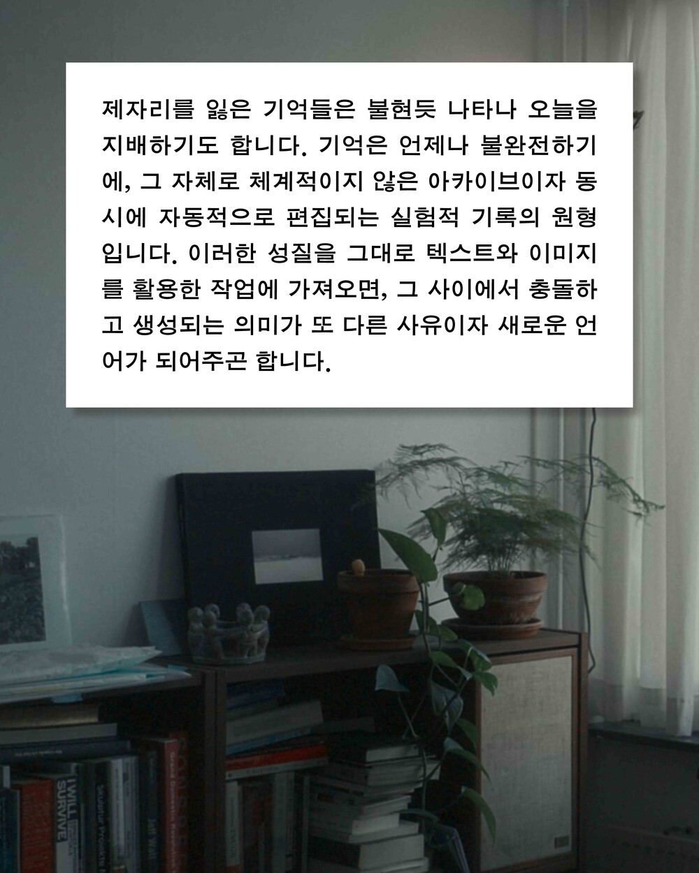 제자리를 잃은 기억들은 불현듯 나타나 오늘을 지배하기도 합니다. 기억은 언제나 불완전하기에, 그 자체로 체계적이지 않은 아카이브이자 동시에 자동적으로 편집되는 실험적 기록의 원형입니다. 이러한 성질을 그대로 텍스트와 이미지를 활용한 작업에 가져오면, 그 사이에서 충돌하고 생성되는 의미가 또 다른 사유이자 새로운 언어가 되어주곤 합니다.