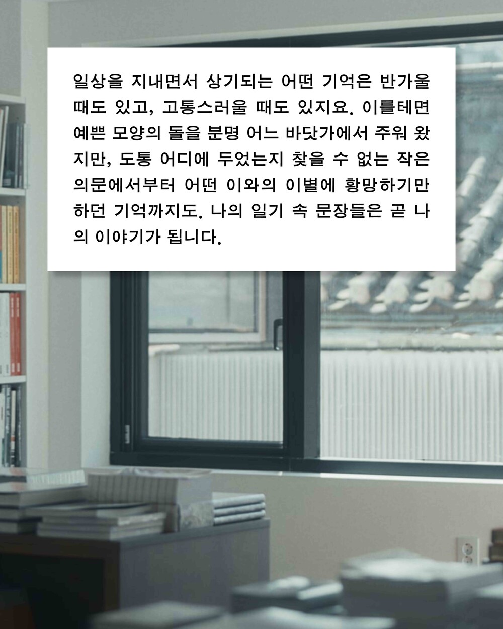 일상을 지내면서 상기되는 어떤 기억은 반가울때도 있고, 고통스러울 때도 있지요. 이를테면 예쁜 모양의 돌을 분명 어느 바닷가에서 주어 왔지만, 도통 어디에 두었는지 찾을 수 없는 작은 의문에서부터 어떤 이와의 이별에 황망하기만 하던 기억까지도. 나의 일기 속 문장들은 곧 나의 이야기가 됩니다.