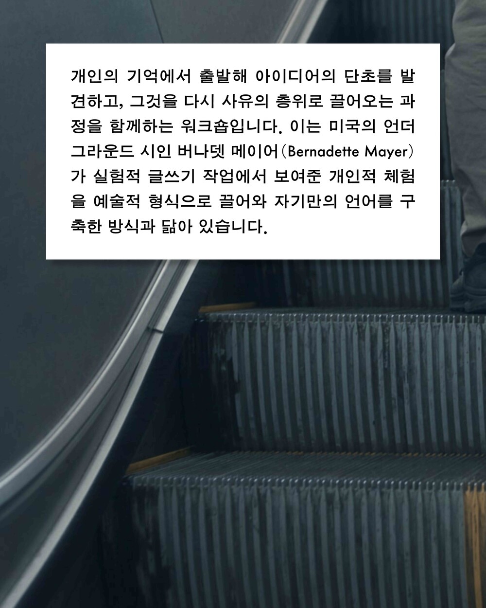개인의 기억에서 출발해 아이디어의 단초를 발견하고, 그것을 다시 사유의 층위로 끌어오는 과정을 함께하는 워크숍입니다. 이는 미국의 언더그라운드 시인 버나뎃 메이어(Bernadette Mayer)가 실험적 글쓰기 작업에서 보여준 개인적 체험을 예술적 형식으로 끌어와 자기만의 언어를 구축한 방식과 닮아 있습니다.