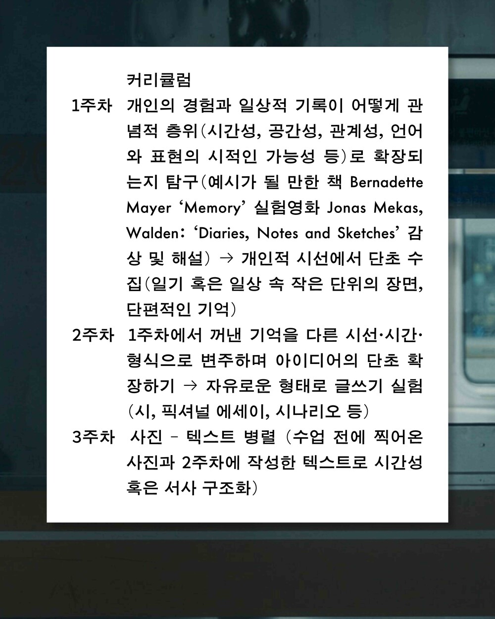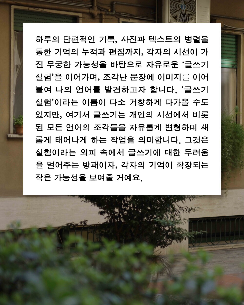 하루의 단편적인 기록, 사진과 텍스트의 병렬을 통한 기억의 누적과 편집까지, 각자의 시선이 가진 무궁한 가능성을 바탕으로 자유로운 '글쓰기 실험'을 이어가며, 조각난 문장에 이미지를 이어붙여 나의 언어를 발견하고자 합니다. '글쓰기 실험'이라는 이름이 다소 거창하게 다가올 수도 있지만, 여기서 글쓰기는 개인의 시선에서 비롯된 모든 언어의 조각들을 자유롭게 변형하며 새롭게 태어나게 하는 작업을 의미합니다. 그것은 실험이라는 외피 속에서 글쓰기에 대한 두려움을 덜어주는 방패이자, 각자의 기억이 확장되는 작은 가능성을 보여줄 거예요.