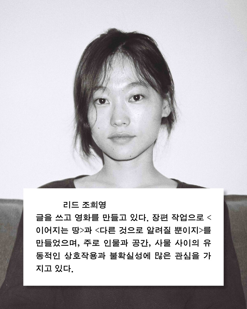 글을 쓰고 영화를 만들고 있다. 장편 작업으로 <이어지는 땅>과 <다른 것으로 알려질 뿐이지>를 만들었으며, 주로 인물과 공간, 사물 사이의 유동적인 상호작용과 불확실성에 많은 관심을 가지고 있다.